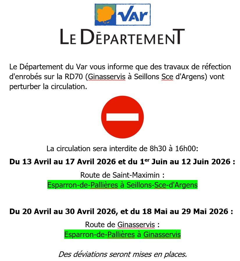 - Déviation : Mise en place via Rians et Varages (côté Esparron / Saint Martin) ainsi que par la RD 3 vers Rians depuis seillons.